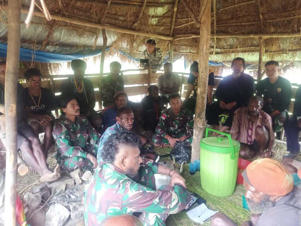 Papua | Mbua. Danramil Persiapan Mbua Lettu Inf Ricky Ricardo Asmuruf menggelar rapat bersama para tokoh penting se Distrik Mbua untuk membahas kegiatan yang akan dilaksanakan dalam waktu dekat. Rapat bersama para tokoh tersebut dilaksanakan di honai perdamaian Koramil Persiapan Mbua. Minggu (23/10/2022).