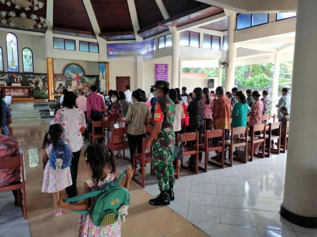 Kodim 1617/Jembrana | Melandainya kasus warga terkonfirmasi positif Covid-19 di Wilayah Jembrana tidak menjadikan Babinsa Desa Blimbingsari Koramil 1617-03/Melaya Kodim 1617/Jembrana Sertu Kadek Wirawanta kendor dalam melaksanakan penegakan disiplin protkes. Bersinergi dengan Bhabinkamtibmas, bersama pihak keamanan gereja Babinsa Desa Blimbingsari berperan aktif memberikan edukasi dan mengajak warga untuk tetap patuhi protokol kesehatan saat melaksanakan kegiatan peribatan.