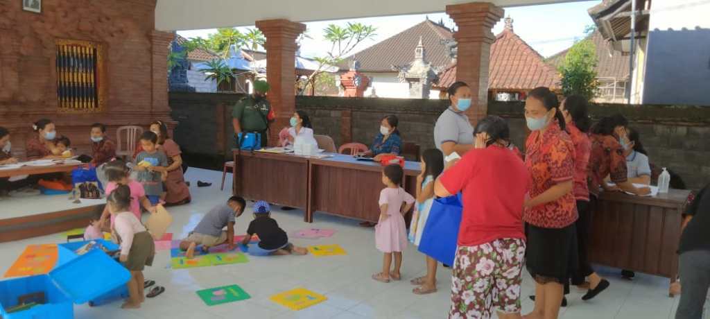 Kodim 1617/Jembrana | Babinsa Desa Batuagung Koramil 1617-01/Negara Pelda I Nyoman Suarken memberikan pendampingan pelayanan Posyandu bagi Balita yang diselenggarakan oleh Bidan Desa Batuagung bekerja sama dengan Koordinator KB Kecamatan Jembrana. Kegiatan Posyandu berupa penimbangan dan imunisasi Balita berlangsung di Balai Banjar Taman, Desa Batuagung, Kecamatan Jembrana, Rabu (22/06/2022)