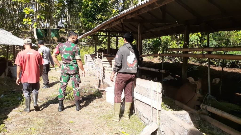Kodim 1617/Jembrana | Babinsa Desa Pergung Koramil 1617-02/ Mendoyo Serda Made Budi Ardita bersama Bhabinkamtibmas memberikan pendampingan saat dilakukannya pengecekan terhadap adanya indikasi suspek Penyakit Mulut dan Kaki (PMK) di kandang sapi Simantri Amerta Sari 307, Banjar Petapan Kelod Desa Pergung. Pengecekan sapi yang disinyalir suspek PKM tersebut dilakukan langsung oleh Kepala Dinas Pertanian dan Pangan Kabupaten Jembrana, Sabtu (02/07/2022)