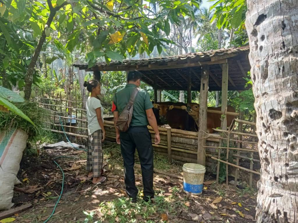 Kodim 1617/Jembrana | Berbagai upaya dilakukan Babinsa jajaran Kodim 1617/Jembrana dalam mencegah penyebaran penyakit kaki dan mulut (PMK) yang sedang mewabah. Selain melakukan pendataan ternak milik warga, memberikan pendampingan vaksinasi dan spraying, para Babinsa juga secara aktif memberi edukasi dan sosialisasi tentang bahaya PMK bagi hewan ternak.