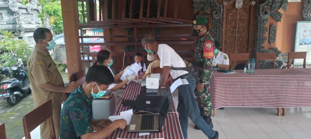 Jembrana | Percepatan vaksinasi Covid-19 kepada seluruh lapisan lapisan masyarakat di Kabupaten Jembrana terus berlanjut. Kali ini vaksinasi yang digelar oleh petugas kesehatan dari Puskesmas I Mendoyo berlangsung di Banjar Dauh Pasar, Desa Pergung, Kecamatan Mendoyo. Vaksinasi tersebut mendapat pendampingan dan pengamanan oleh Babinsa dan Bhabinkamtibmas, Senin (18/07/2022)