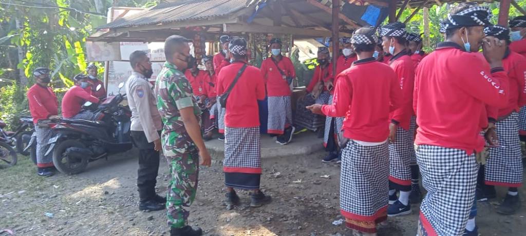 Jembrana | Babinsa Yehembang Kauh Koramil 1617-02/ Mendoyo Serda Zainal Efendi bersinergi dengan Bhabinkamtibmas dan Pecalang melaksanakan pengamanan saat berlangsungnya Upacara Karya Atma Wedana Mamukur (Ngaben Massal) yang berlangsung Setra Banjar Adat Desa Yehembang Kauh, Kecamatan Mendoyo, Kabupten Jembrana, Jumat (29/07/2022)