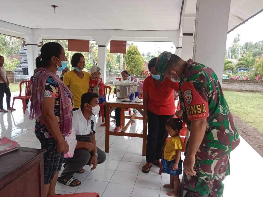 Jembrana | Babinsa Desa Candikusuma Koramil 1617-03/Melaya Serka Dewa Budiwilantara memberikan pendampingan pelayanan Posyandu bagi Balita yang diselenggarakan oleh Bidan Desa Candikusuma. Kegiatan Posyandu berupa penimbangan dan imunisasi Balita berlangsung di Banjar Moding, Desa Candikusuma, Kecamatan Melaya, Kabupaten Jembrana, Rabu (10/08/2022)