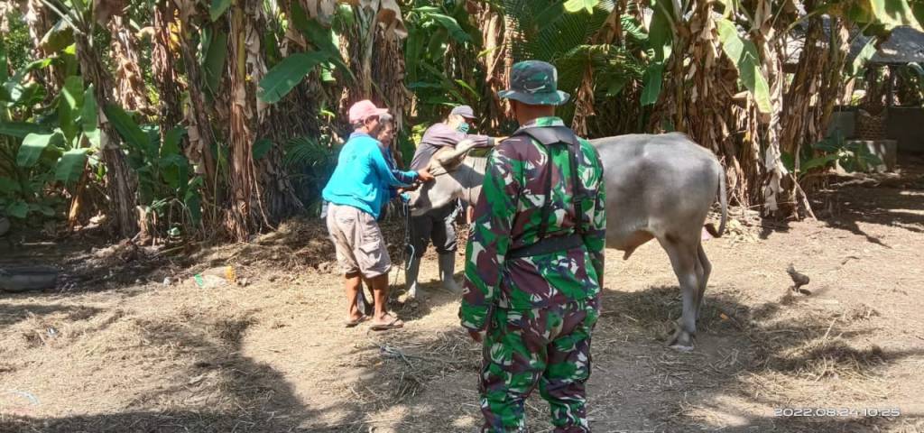 Jembrana | Puluhan ekor sapi di Banjar Baluk Rening Rening, Desa Baluk, Kecamatan Negara, Kabupaten Jembrana kembali diberikan vaksinasi PMK oleh petugas Vaksinator dari Dinas Pertanian dan Pangan Kabupaten Jembrana. Dalam pelaksanaan vaksinasi tersebut, Babinsa Desa Baluk Koramil 1617-01/Negara Serda Dwi Putra bersama Bhabinkamtibmas turut berikan pendampingan, Rabu (24/08/2022).
