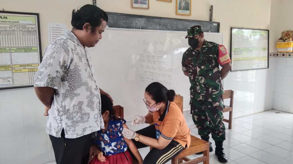 Babinsa Mendoyo Dauh Tukad Koramil 1617-02/Mendoyo saat dikonfirmasi mengatakan diberikannya vaksinasi kepada siswa SD bertujuan untuk membentuk Immunitas (kekebalan tubuh) anak secara individu dan eradikasi atau pembasmian suatu penyakit dari penduduk suatu daerah.