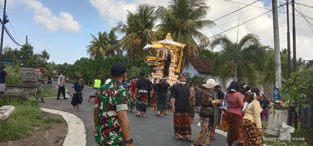 Jembrana | Babinsa Desa Baluk Koramil 1617-01/Negara Serda Dwi Putra turut mengamankan prosesi pengabenan salah satu warga binaannya. Pengamanan dilakukan bersinergi dengan Bhabinkamtibmas dan pecalang Desa Adat. Selain memberikan pengamanan demi kelancaran prosesi pengabenan Serda Dwi Putra juga mengingatkan keluarga maupun warga yang hadir agar senantiasa mematuhi Prokes, Senin (12/09/2022)