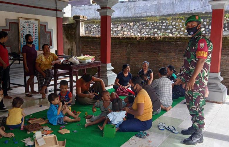 Jembrana | Babinsa Desa Yehembang Kauh Koramil 1617-02/ Mendoyo Serda Zainal Efendi memberikan pendampingan pelayanan Posyandu bagi Balita yang diselenggarakan oleh Bidan Desa. Kegiatan Posyandu berupa penimbangan dan Imunisasi Balita berlangsung di Posyandu Anggrek Wangi I Banjar Munduk Angrek, Desa Desa Yehembang Kauh, Kecamatan Mendoyo, Kabupaten Jembrana, Selasa (13/09/2022)
