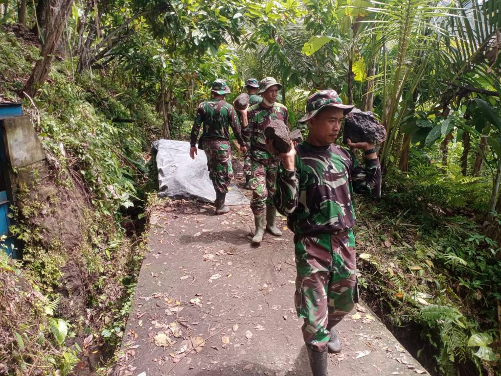 Saat ini, proses pengerjaan pompa hydram pada tahap pembuatan bak sadap yang nantinya akan menjadi tempat penampungam air yang akan dialirkan menuju pompa hydram. Sulitnya akses jalan ditambah medan yang curam dan licin tidak menyurutkan semangat TNI bersama masyarakat dalam mendroping material menuju sasaran.