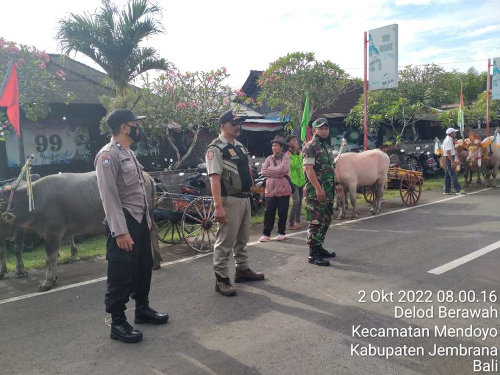 Jembrana | Babinsa Delodberawah Koramil 1617-02/Mendoyo Serda I Putu Wikanada turut mengamankan lomba pacuan kerbau (Mekepung) yang berlangsung di sirkuit Mekepung, Desa Delod Berawah, Kecamatan Mendoyo, Kabupaten Jembrana. Saat melaksanakan pengamanan, dirinya selalu bersinergi dengan Bhabinkamtibmas, Poldes dan Pecalang Desa Adat setempat, Minggu (02/10/2022)