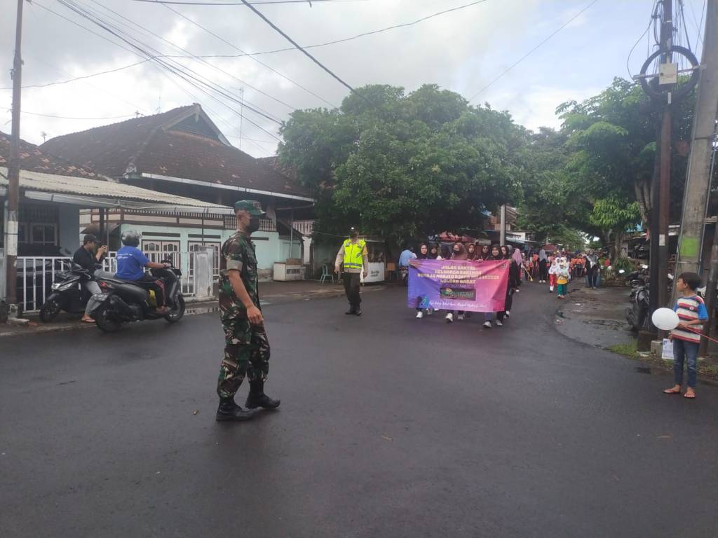 Jembrana | Babinsa Kelurahan Loloan Barat Koramil 1617-01/Negara melaksanakan pengamanan jalan santai dalam rangkaian peringatan Maulid Nabi Muhammad SAW 1444 H. Dalam memberikan pengamanan Babinsa Kelurahan Loloan Barat bersinergi dengan Bhabinkamtibmas dan Polkel Loloan Barat, Minggu (09/06/2022)