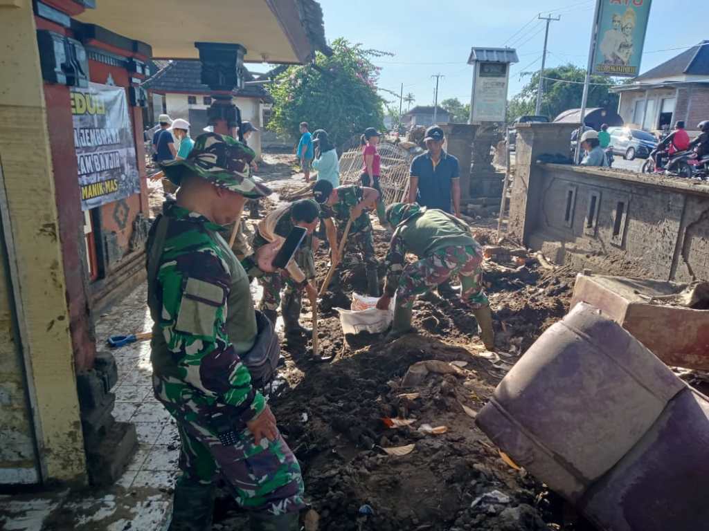 Untuk membantu kesulitan warga yang terdampak banjir bandang, Kodim 1617/Jembrana beserta jajarannya kembali melakukan karya bakti pembersihan material banjir. Dengan peralatan yang digunakan, tumpukan tanah maupun lumpur di gali lalu dibuang ketempat yang telah ditentukan.