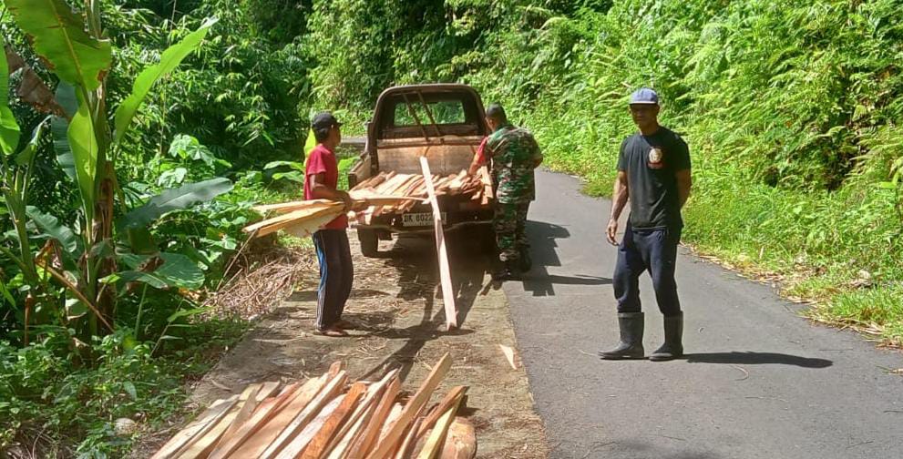 Jembrana | Warga Banjar Sekar Kejula Kelod, Desa Yehembang Kauh, Kecamatan Mendoyo, Kabupaten Jembrana difasilitasi oleh Babinsa Yehembang Kauh Koramil 1617-02/Mendoyo Serda Zainal Efendi membuat jembatan darurat pengganti jembatan plat deker yang hanyut dibawa banjir tempo lalu bersamaan dengan Jembatan besar permanen penghubung Desa Yehembang Kauh dengan Desa Yehembang, Jumat (02/12/2022)