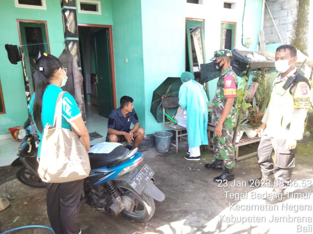 Jembrana | Babinsa Desa Tegal Badeng Timur, Koramil 1617-01/Negara, bersinergi dengan Babinkamtibmas memberikan pendampingan sekaligus pengamanan saat berlangsungnya kegiatan Testing dan Tracing Kontak Erat terhadap warga oleh Tim Tracer dari Puskesmas II Negara, Senin (23/01/2023)