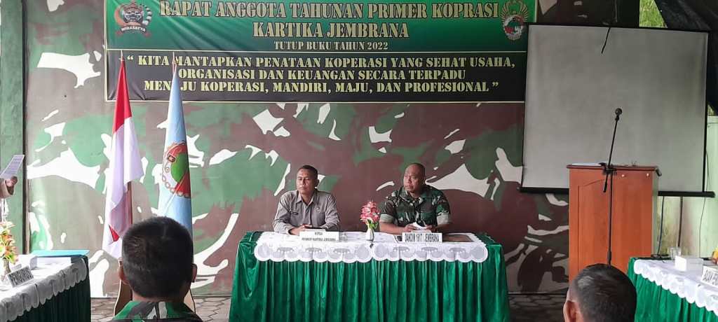 Jembrana | Dalam rangka menyampaikan pertanggung jawaban pengurus dan badan pengawasan anggota tentang hasil pelaksanaan kerja tahun 2022, Primkop Kartika Jembrana, Kodim 1617/Jembrana menggelar Rapat Anggota Tahunan (RAT) tutup buku 2022 bertempat di Garase Makodim 1617/Jembrana, Jln. Ngurah Rai No 135, Kelurahan Dauhwaru, Kecamatan Jembrana, Kabupaten Jembrana, Senin (06/02/2023)