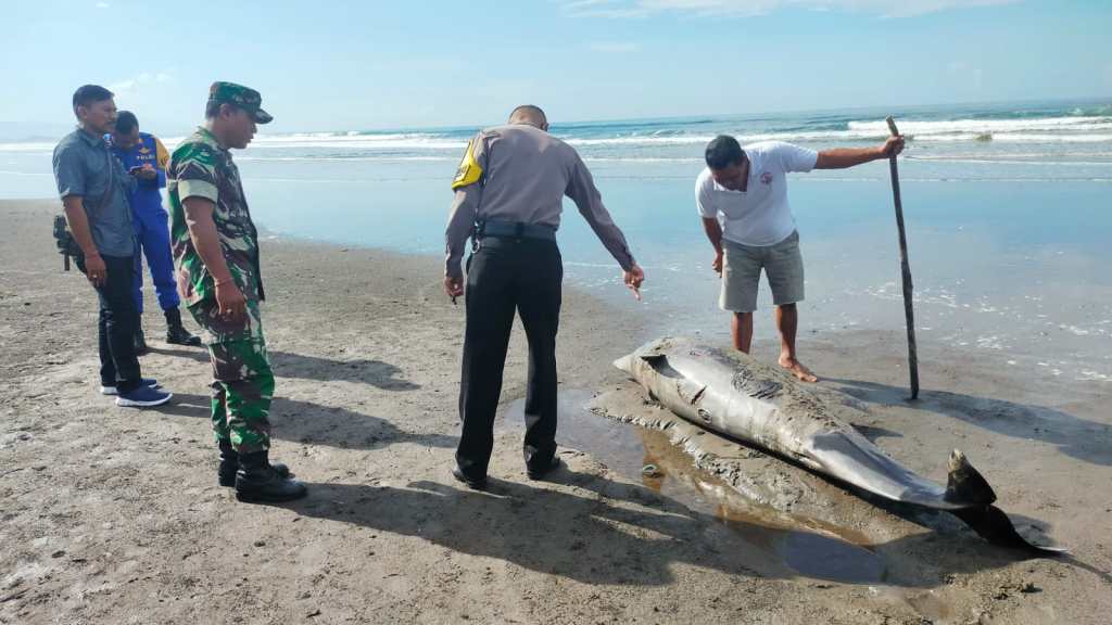 Jembrana | Beberapa pekan yang lalu telah terdapat fenomena dimana seekor ikan paus terdampar di wilayah pantai Yeh Leh perbatasan Jembrana-Tabanan, dan sekarang warga dikagetkan dengan penemuan Ikan lumba-lumba yang terdampar di pantai Br. Anyar Tembles, Desa Penyaringan, Kecamatan Mendoyo, Kabupaten Jembrana, Kamis (27/04/2023)