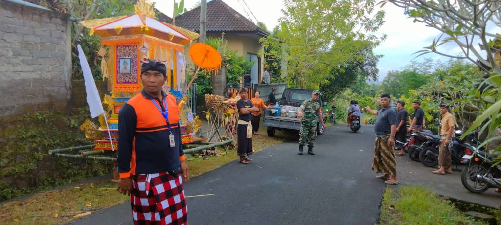 Jembrana | Untuk memberi rasa aman dan nyaman pada pelaksanaan upacara ngaben, Babinsa Desa Batuagung Koramil 1617-01/Negara, Pelda I Nyoman Suarken bersinergi dengan Babinkamtibmas, Polprades dan Pecalang Desa Adat Batuagung melaksanakan pengamanan dan membantu mengatur lalu lintas pada gelaran upacara Pitra Yadnya Ngaben di Setra Desa Adat Batuagung, Desa Batuagung, Kecamatan Jembrana, Kabupaten Jembrana, Jumat (28/04/2023).
