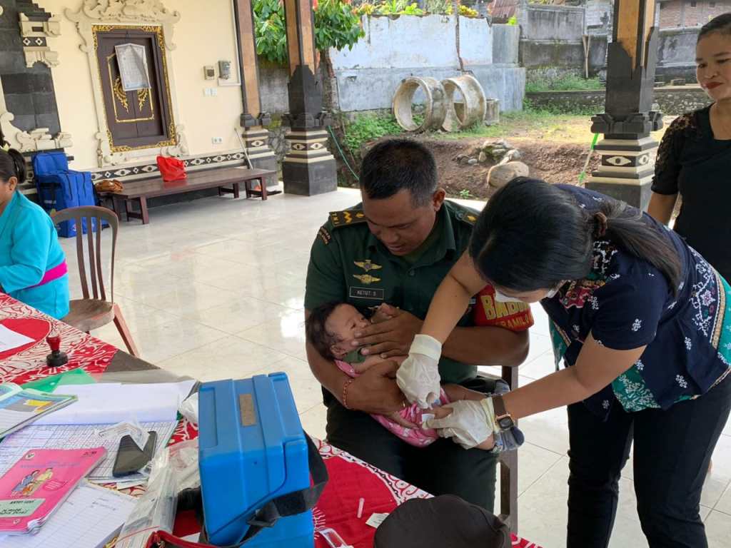 Jembrana | Babinsa Desa Gumbrih Koramil 1617-04/Pekutatan, Pelda Ketut Suburyana melakukan pendampingan dan pengamanan dalam kegiatan Posyandu Bayi dan Balita, kegiatan tersebut dilaksanakan di Banjar Tunjung, Desa Gumbrih, Kecamatan Pekutatan, Kabupaten Jembrana. Kamis (06/07/2023)