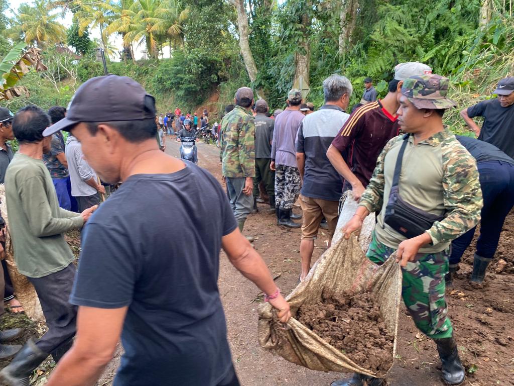 Terpantau di lokasi Babinsa bersama sama dengan warga bahu membahu membersihkan material longsoran. (Pendim Jbr/Red).