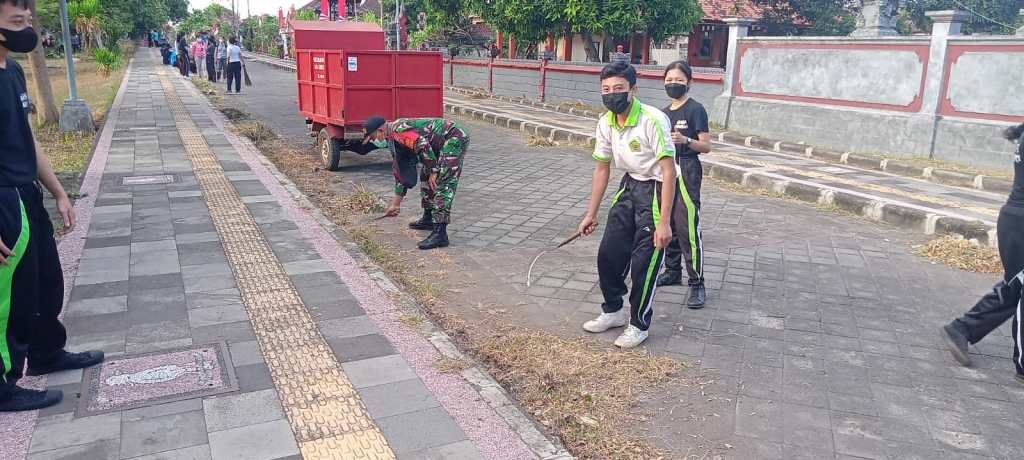 Jembrana | Bentuk nyata kepedulian terhadap lingkungan dan dalam rangka menyambut HUT Kemerdekaan RI yang ke 78 Tahun 2023, Babinsa Kelurahan Gilimanuk, Koramil 1617-03/Melaya, Serda Mohamad Adam bersama Instansi terkait melaksanakan kegiatan kerja bakti/Gotong royong pembersihan sampah Plastik dan daun daun kering yang ada di sekitar lapangan Sepakbola, Kelurahan Gilimanuk, Kecamatan Melaya, Kabupaten Jembrana. Jumat (28/07/2023).