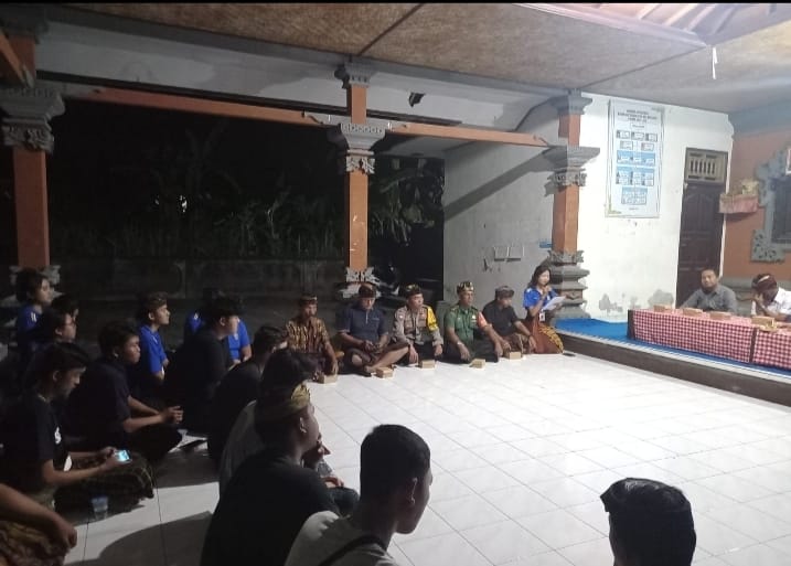 Jembrana | Babinsa Desa Batuagung Koramil 1617-01/Negara, Pelda I Nyoman Suerken bersama instansi terkait memantau dan mengikuti kegiatan sosialisasi “Pergaulan Bebas” yang diadakan oleh Mahasiswa KKN Universitas Udayana, bertempat di Balai Banjar Anyar, Desa Batuagung, Kecamatan Jembrana, Kabupaten Jembrana.
