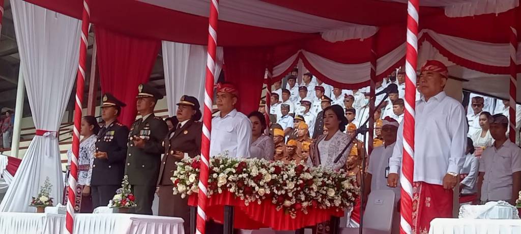Jembrana | Komandan Kodim 1617/Jembrana Letkol Inf Teguh Dwi Raharja, S.Sos bersama Forkopimda Kabupaten Jembrana mengikuti Upacara Pengibaran Sang Merah Putih Peringatan Ke-78 Detik-detik Proklamasi Republik Indonesia Tahun 2023. Dipimpin langsung Bupati Jembrana I Nengah Tamba, S.H selaku Inspektur Upacara, Sementara itu Komandan Upacara dijabat oleh Danramil 1617-01/Negara Kapten Inf I Nyoman Gede Andika, SH dan Pasi Pers Kodim 1617/Jembrana Kapten Chb. Drs. Karyanto sebagai Perwira Upacara. Kamis (17/08/2023)