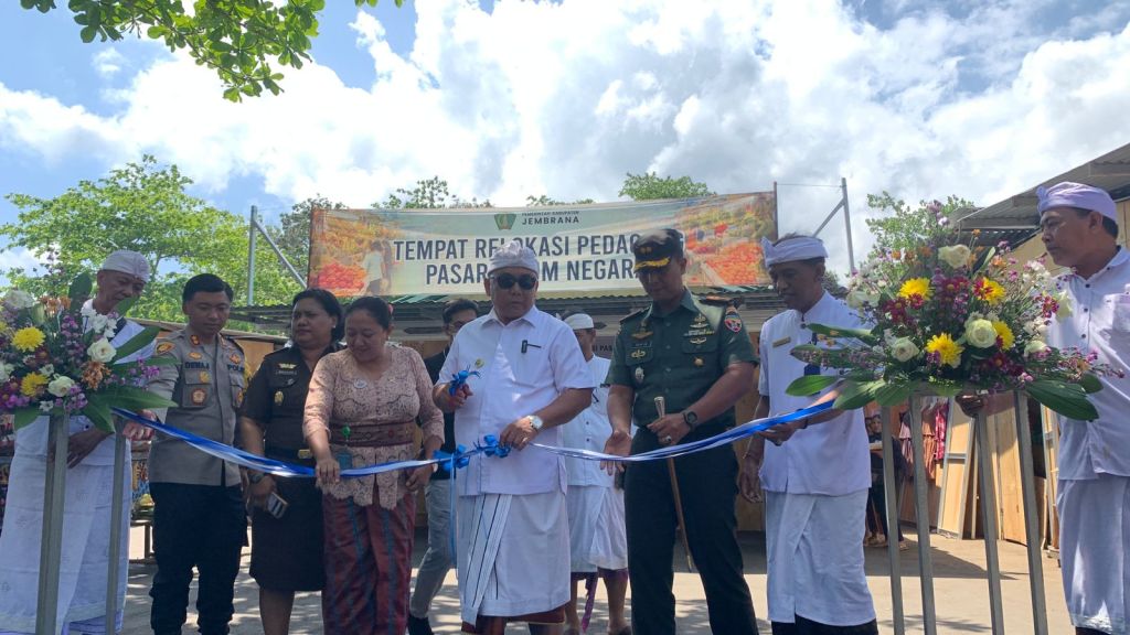 Kegiatan dilanjutkan Peresmian tempat relokasi Pasar Umum Negara ditandai dengan pemotongan Pita, peninjauan tempat relokasi Pasar Umum Negara oleh Bupati Jembrana yang didampingi Forkopimda. (Pendim Jbr/Red).