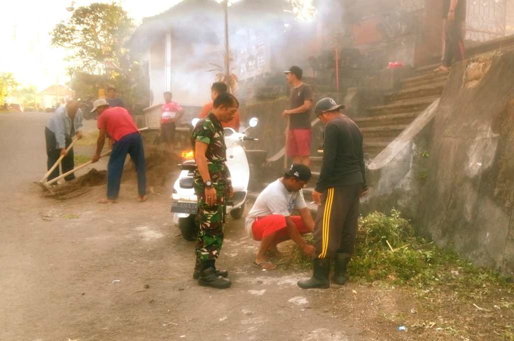 Jembrana | Babinsa Kelurahan Tegalcangkring Koramil 1617-02/Mendoyo Serda Suwardi bersama-sama dengan warga masyarakat di wilayah binaan melaksanakan kegiatan Gotong Royong pembersihan sampah secara serentak di masing masing.
