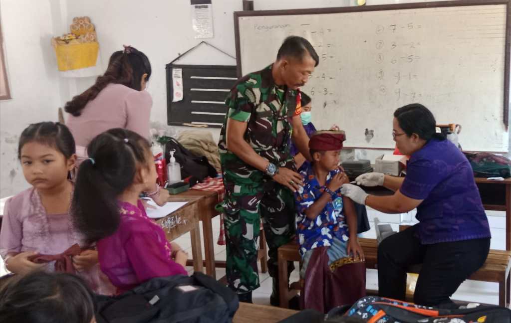 “Kegiatan Imunisasi yang dilakukan yaitu pemberian Imunisasi kepada anak usia Sekolah Dasar, pemberian Imunisasi kali ini merupakan Imunisasi lanjutan yang bertujuan untuk meningkatkan perlindungan terhadap penyakit campak, rubella, difteri, tetanus dan kanker serviks, dan kehadiran Kami selaku Babinsa dalam pelaksanaan kegiatan Imunisasi ini adalah untuk memberikan dukungan moril terhadap para siswa, agar para siswa tidak merasa takut terhadap suntikan Imunisasi, dan para siswa agar lebih berani karena didorong oleh semangat tadi, sehingga kita hibur mereka, kita beri semangat untuk melawan rasa takut dan untuk menimbulkan rasa percaya diri, karena mereka harus mendapatkan imunisasi tersebut,” Ujar Serda Suwardi. (Pendim Jbr/Red).