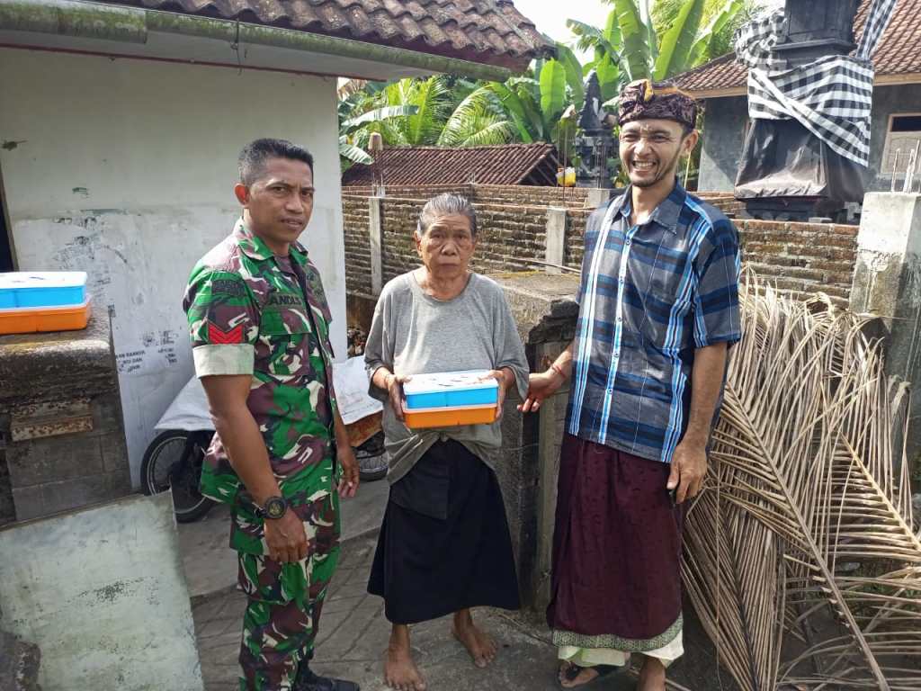 Jembrana | Bersama perangkat Desa lainnya Babinsa Pohsanten Kopka Andi Sepriadi ambil bagian dalam rangka membantu Dinas Sosial Kabupaten Jembrana dalam mendistribusikan makanan sehat siap saji kepada para lansia yang ada di wilayah binaan Bertempat di Desa Pohsanten, Kecamatan Mendoyo, Kabupaten Jembrana, Kamis (21/09/2023)