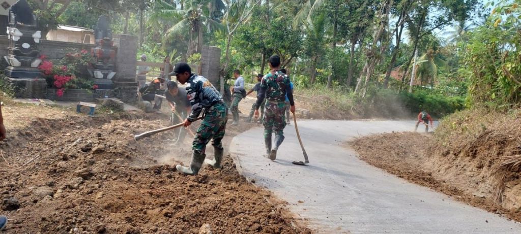 Jembrana | Progres pengecoran Rabat Beton jalan yang dikerjakan Satgas TMMD Ke 118 Kodim 1617/Jembrana Tahun 2023 kali ini sudah mencapai tahap finishing. Hari ini pekerjaan dilanjutkan dengan meratakan tanah di bahu kiri dan kanan rabatan dengan metoda mengangkat timbunan sepanjang selokan agar jalan rabatan tidak terlalu kontras dengan jalan sebelumnya, karena bila dibiarkan akan berbahaya khususnya bagi pengguna jalan yang menggunakan kendaraan bermotor. Minggu (15/10/2023)