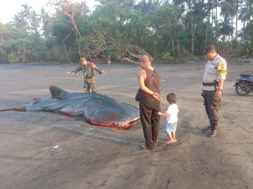 Tiba dilokasi, benar adanya terdapat Ikan Hiu/Paus Jenis Rhincodon Typus yang terdampar di Pesisir Pantai tersebut sudah dalam keadaan mati dengan ukuran Panjang kurang lebih sekitar 5 Meter, dan diameter sekitar 1.5 Meter.