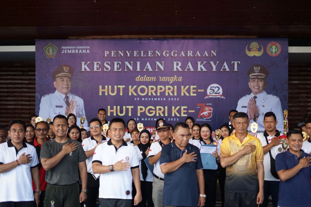 Jembrana | Perayaan Hari Ulang Tahun KORPRI ke 52 dan Hari Ulang Tahun PGRI ke 78 Tahun 2023 di Kabupaten Jembrana dimeriahkan dengan kegiatan Jalan santai, yang dipusatkan di Halaman Gedung Kesenian Dr. Ir. Soekarno, Kelurahan Dauhwaru, Kecamatan Jembrana, Kabupaten Jembrana. Jum’at (24/11/2023)